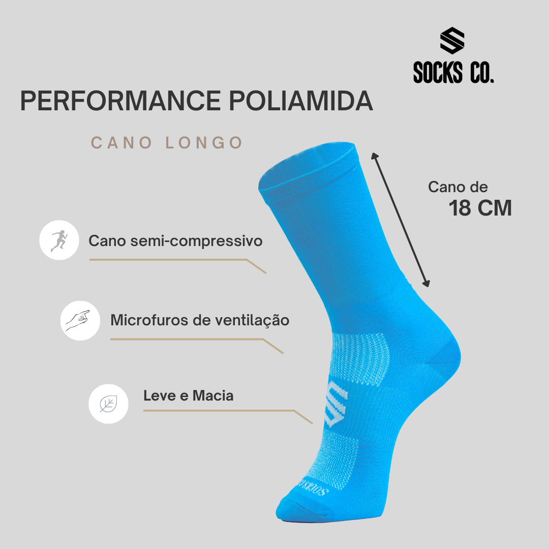 A combinação das fibras tecnológicas poliamida e elastano tornam as meias performance leves, respiráveis e semi-compressivas.