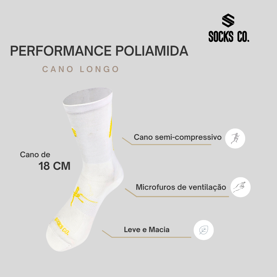 A combinação das fibras tecnológicas poliamida e elastano tornam as meias performance leves, respiráveis e semi-compressivas.