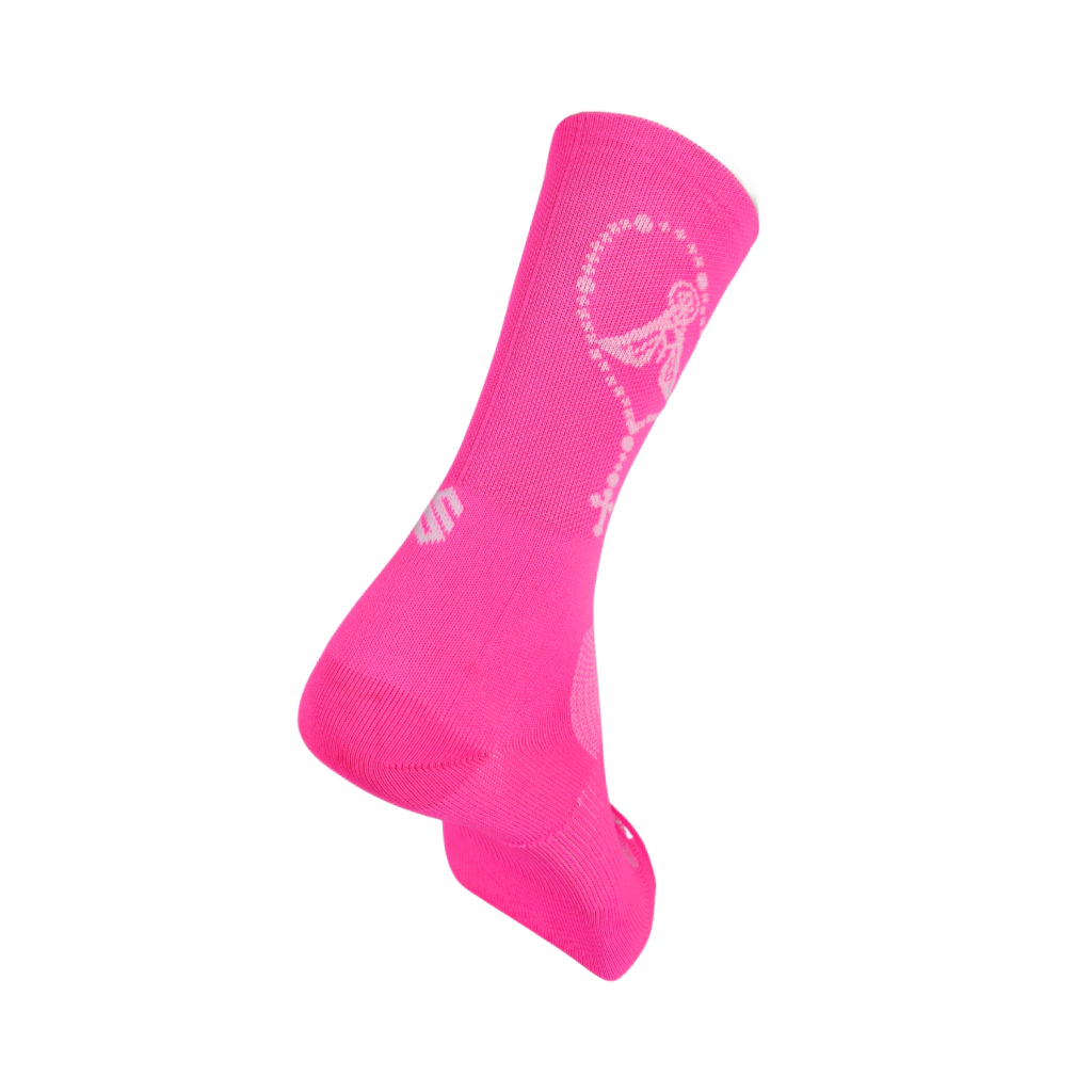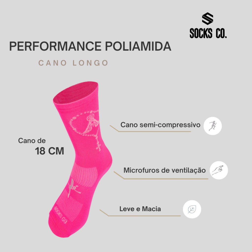 A combinação das fibras tecnológicas poliamida e elastano tornam as meias performance leves, respiráveis e semi-compressivas.