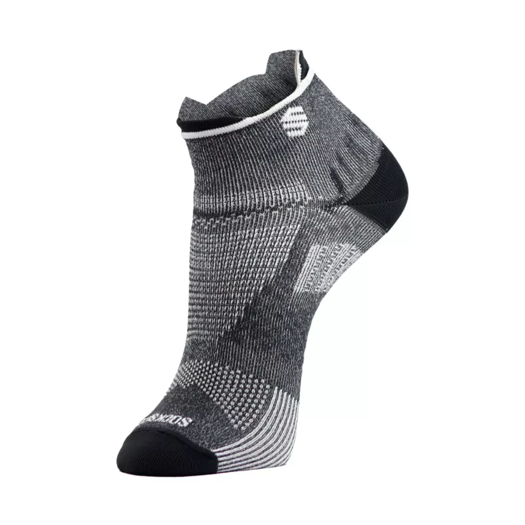 O elastano promove um calce justo, sem sobras de tecidos no calçado, e uma compressão graduada no pé.
