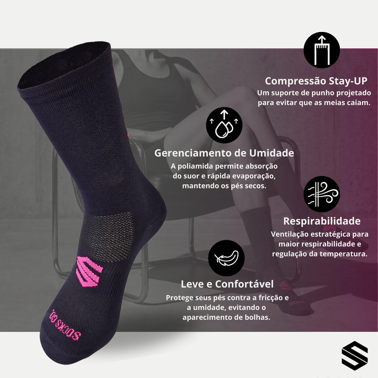 O elastano promove um calce justo, sem sobras de tecidos no calçado, e um cano semi-compressivo que auxilia na circulação sanguínea.