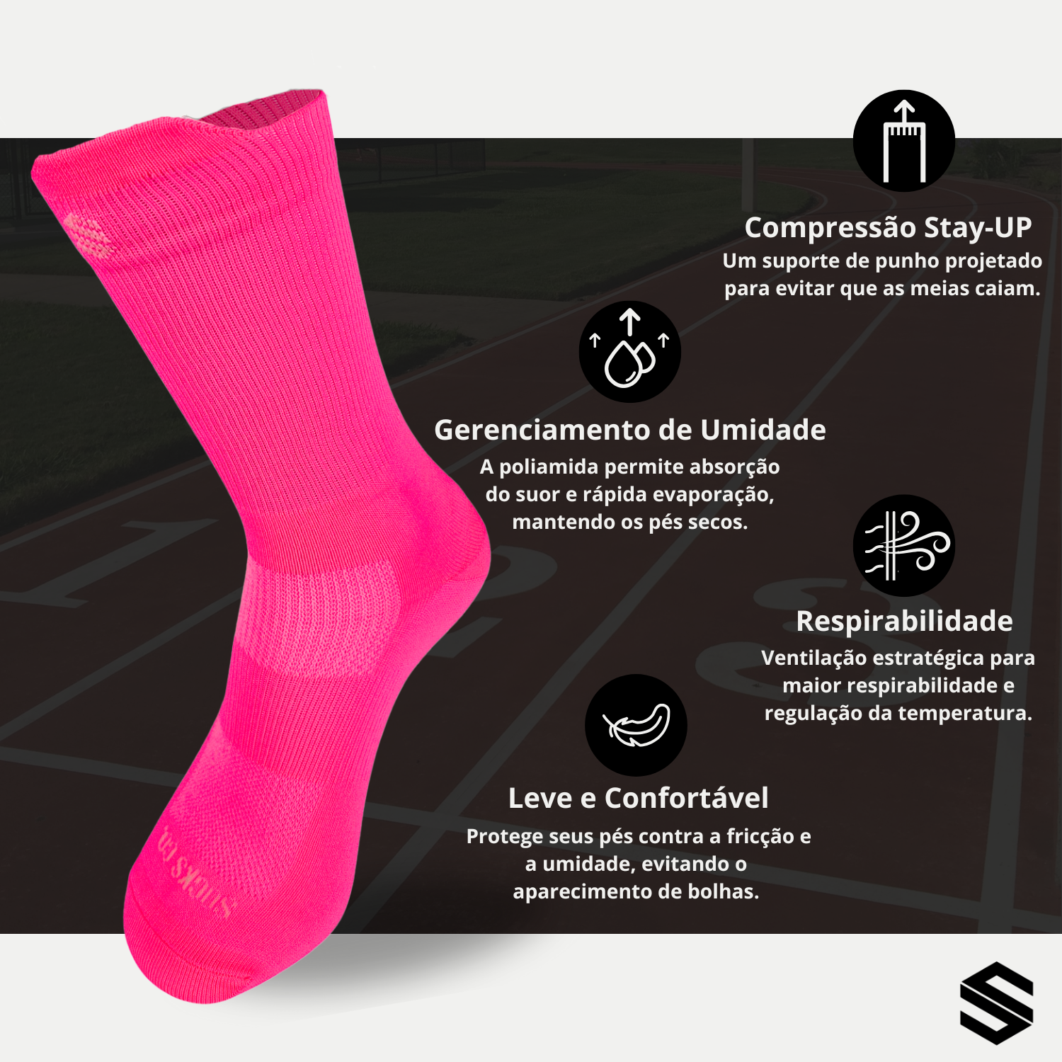 A combinação das fibras tecnológicas poliamida e elastano tornam as meias performance leves, respiráveis e semi-compressivas.