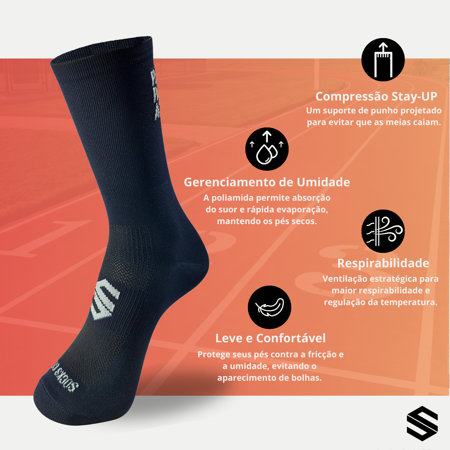 A combinação das fibras tecnológicas poliamida e elastano tornam as meias performance leves, respiráveis e semi-compressivas.